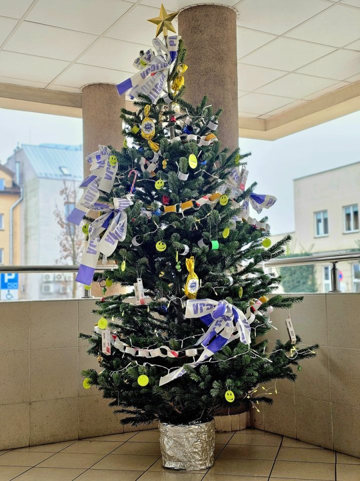 - Choinka stoi przed budynkiem komendy; elementy odblaskowe są rozdawane nieodpłatnie.