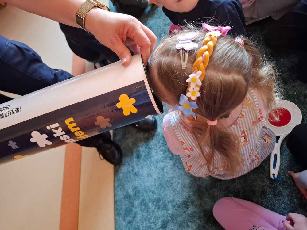 Asp. Wioletta Domagała przypomniała maluchom jak prawidłowo korzystać z przejść dla pieszych, którą stroną drogi iść gdy brak chodnika oraz czego unikać podczas zabawy w pobliżu ulicy. Dzieci poznały znaczenie noszenia elementów odblaskowych dzięki zabawnej „magicznej tubie” i zadeklarowały, że będą przypominać o odblaskach rodzicom podczas wieczornych i jesiennych spacerów.