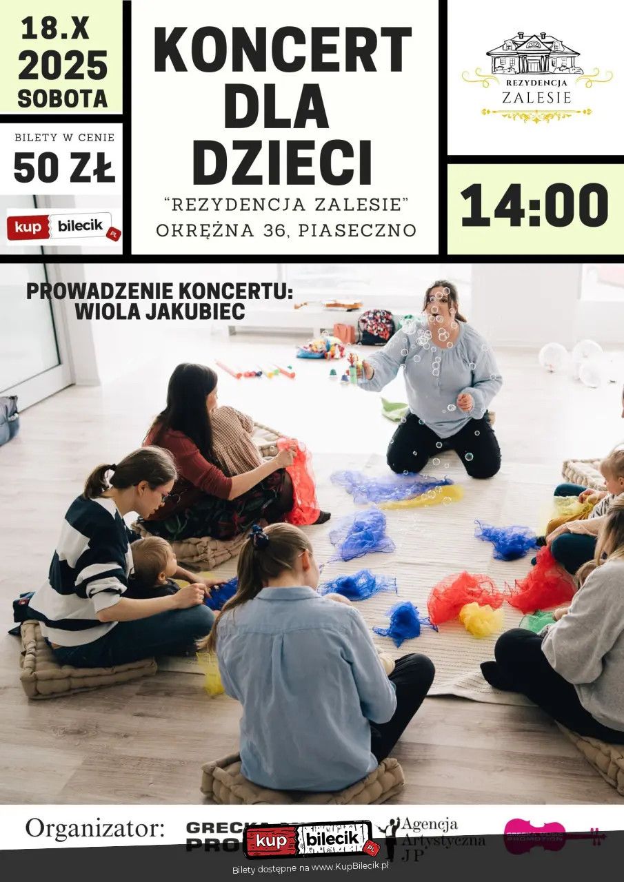 bilety: Już 18 października (sobota) o godz. 14:00 zapraszamy najmłodszych (0-6 lat) wraz z rodzicami na wyjątkowe spotkanie muzyczne! Koncert poprowadzi Wiola Jakubiec - certyfikowana instruktorka metody Gordona, która wprowadzi dzieci w świat muzyki poprzez śpiew, rytm i ruch. Cykliczne koncerty dla dzieci w Rezydencji Zalesie artyści: ONCERTY DLA DZIECI w Rezydencja ZalesieWyobraźcie sobie ciepłą, domową atmosferę Rezydencji Zalesie: wygodne poduchy na podłodze, miękkie światło, bliskość muzyków i pełne bezpieczeństwo dla maluchów. Dzieci będą mogły usiąść tuż obok artystów, poczuć rytm i włączyć się w muzyczną zabawę, a rodzice – uczestniczyć razem z nimi. Koncert odbywa się w duchu pedagogiki gordonowskiej – to muzyczna przygoda, w której aktywnie uczestniczą zarówno dzieci, jak i ich opiekunowie. Bilety do nabycia na: KupBilecik.pl |