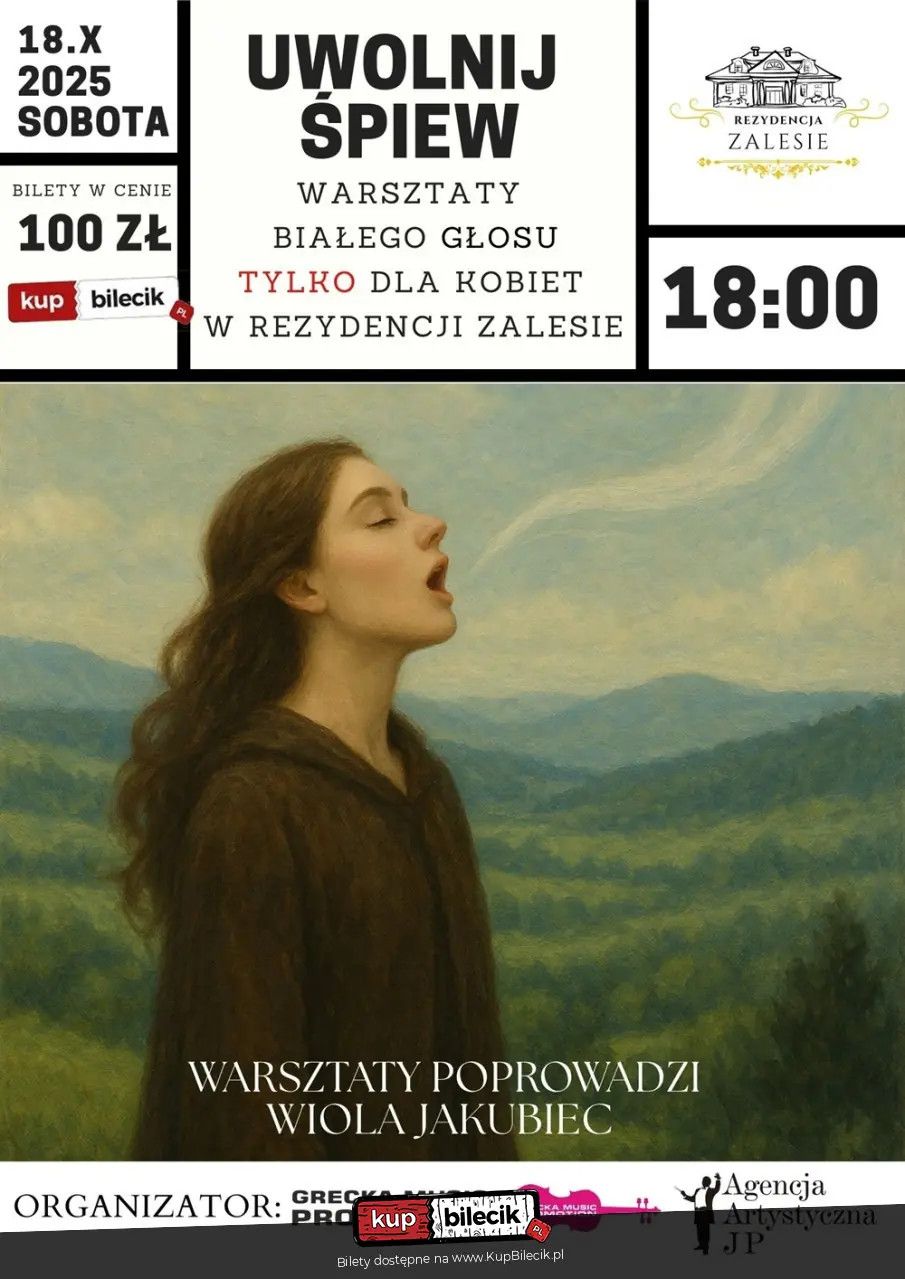 bilety: 18 października 2025 roku o godzinie 18:00 w klimatycznej Rezydencji Zalesie odbędzie się wyjątkowe spotkanie dedykowane kobietom - warsztaty białego głosu prowadzone przez Wiolę Jakubiec. To niezwykłe wydarzenie jest zaproszeniem do odkrycia swojej naturalnej mocy poprzez głos - pierwotny, autentyczny i pełen energii. Uczestniczki będą miały okazję: Warsztaty białego głosu dla kobiet artyści: Warsztaty dedykowane kobietomWyjątkowe spotkanie dedykowane kobietom - warsztaty białego głosu prowadzone przez Wiolę Jakubiec. To niezwykłe wydarzenie jest zaproszeniem do odkrycia swojej naturalnej mocy poprzez głos - pierwotny, autentyczny i pełen energii. Warsztaty to nie tylko ćwiczenia wokalne - to również głęboka podróż w głąb siebie, do intuicji i emocji, które można wyrazić poprzez głos. Spotkanie odbędzie się w atmosferze akceptacji i wsparcia, tworząc przestrzeń do swobodnej ekspresji i pełnego wybrzmienia. Bilety do nabycia na: KupBilecik.pl |